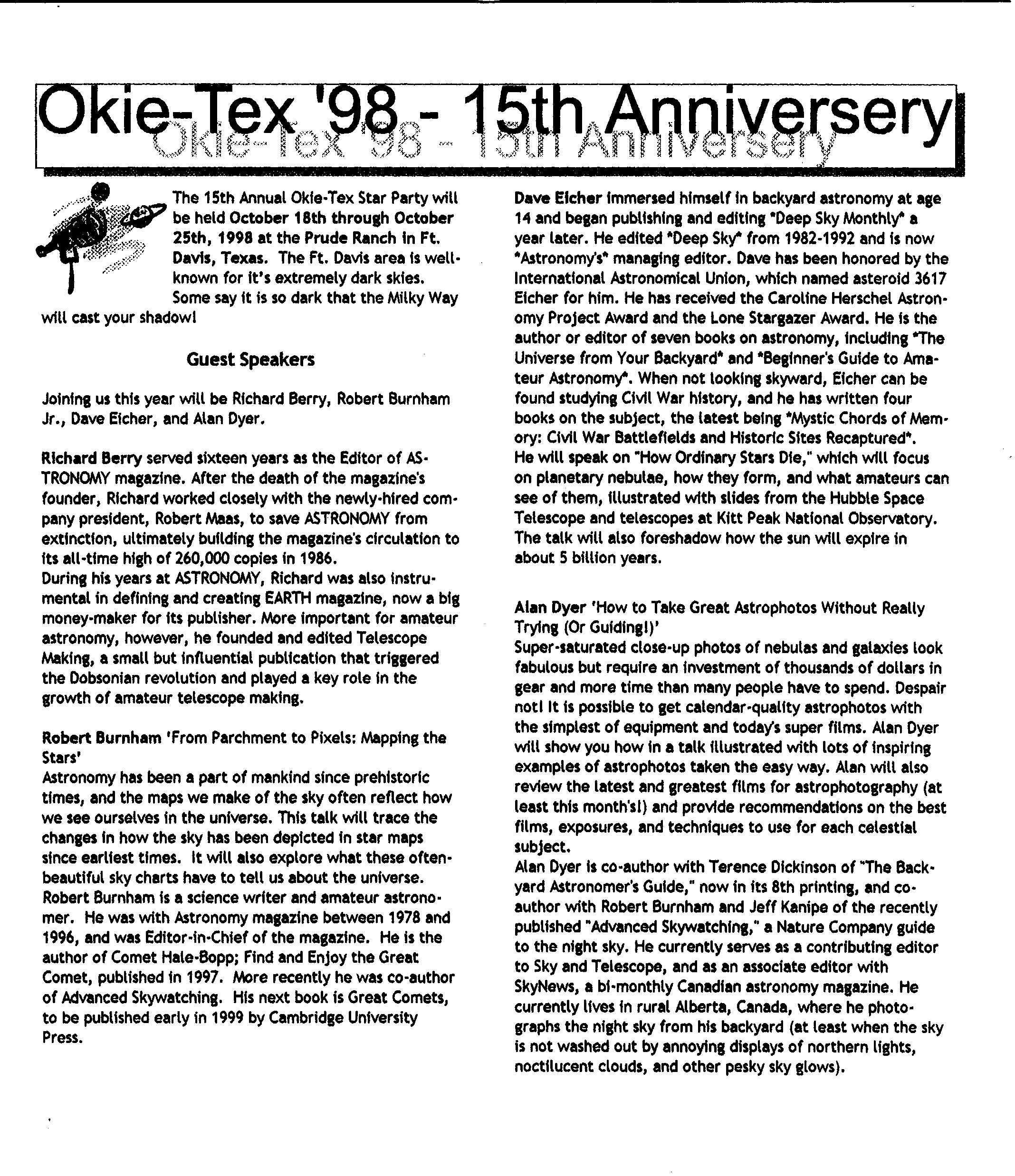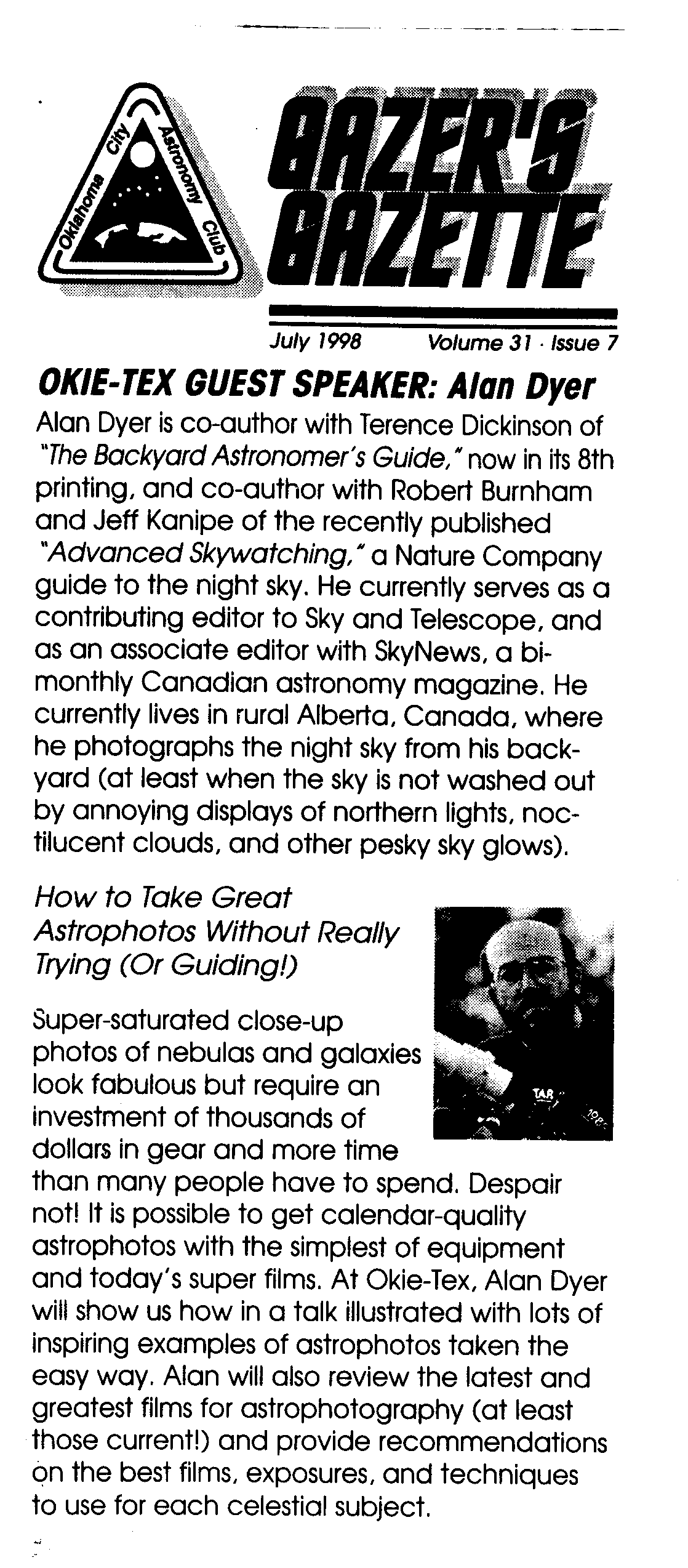 The cover page to the July, 1998 Gazer's Gazette with a story on Alan Dyer, Okie-Tex guest speaker that year. The 1998 Okie-Tex was the 15th anniversary for our star party. |