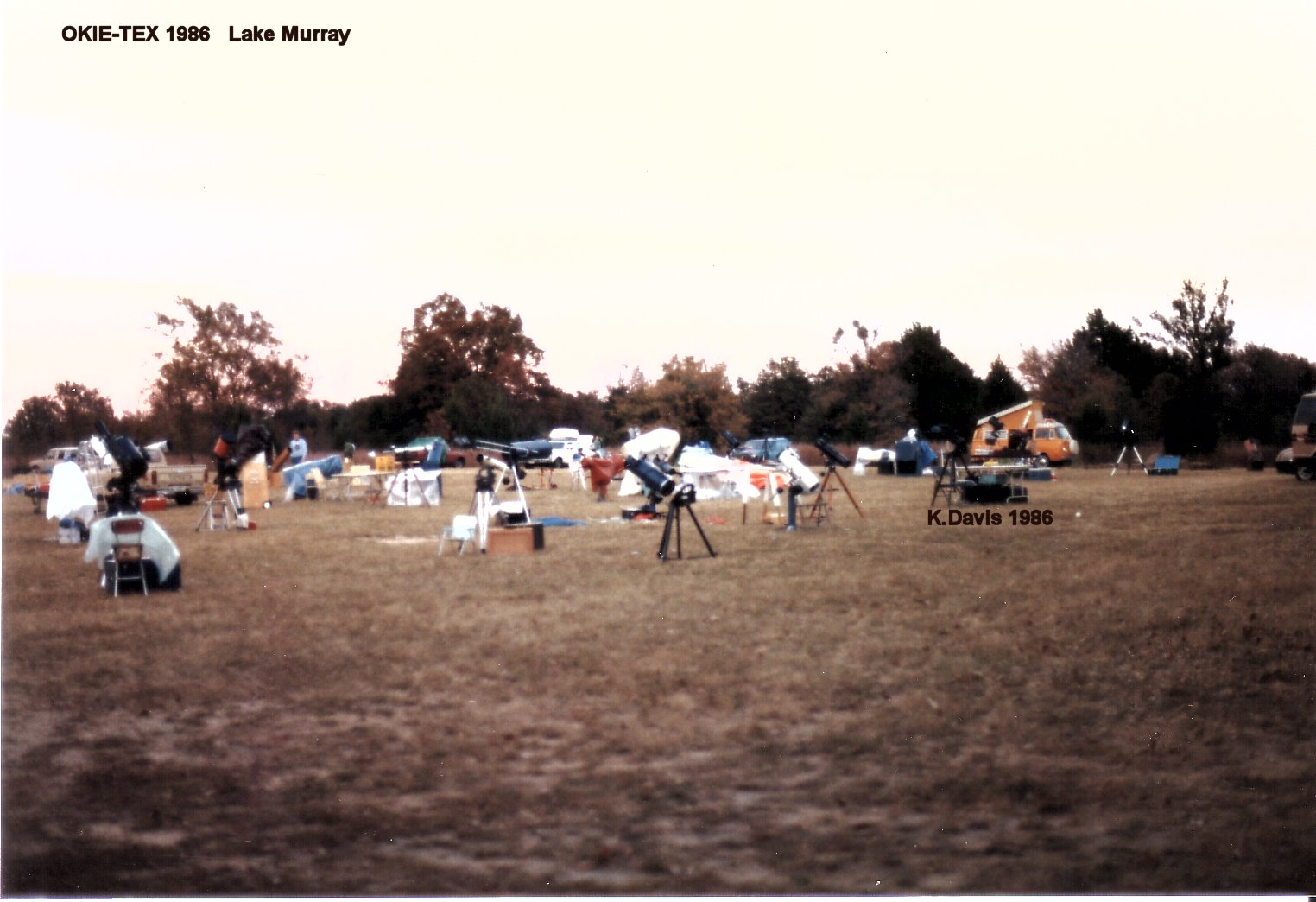 The observing field at the 1986 Okie-Tex Star Party held at Lake Murray. The first Okie-Tex Star Party was held in 1984. The current home of Okie-Tex is at Camp Billy Joe near Kenton, Oklahoma in the Oklahoma Panhandle. Photo credit, Kevin Davis. |